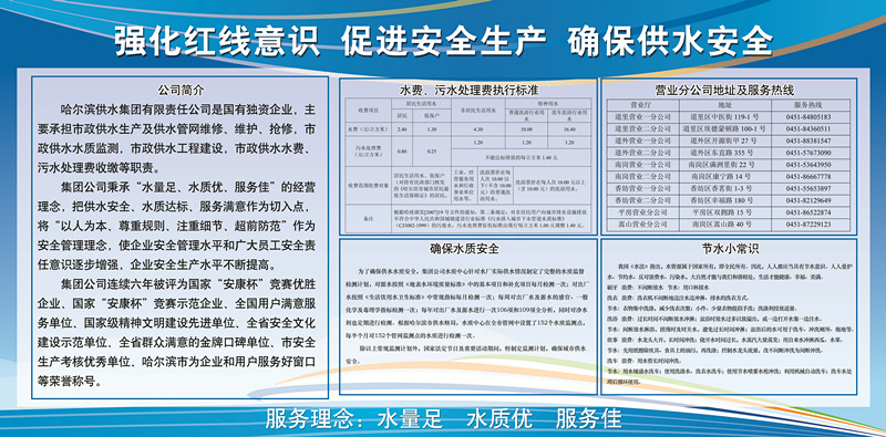 在活动现场,集团公司围绕“强化红线意识,促进安全发展”这一主题,在现场摆放的安全宣传展板8块,以图文并茂的形式向过往群众宣传安全知识,期间发放《供水服务指南》、《安全生产法》、《安全常识》等宣传资料300余份,接受现场群众咨询12人次。通过宣传讲解,不仅使群众了解了供水常识,展现了企业风貌,提高了社会认知度,更体现了集团公司“水量足 水质优 服务佳”的服务理念。
