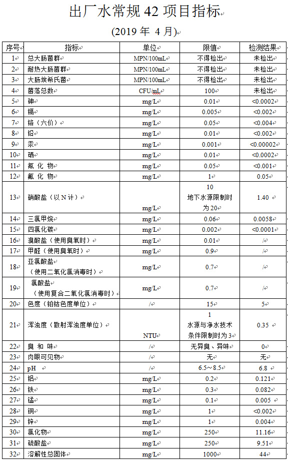 2019年4月出厂水常规42项目指标