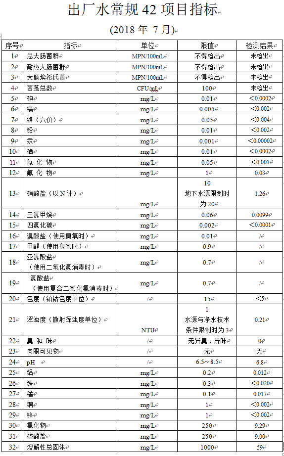 出厂水常规42项指标 (2018年 7月)